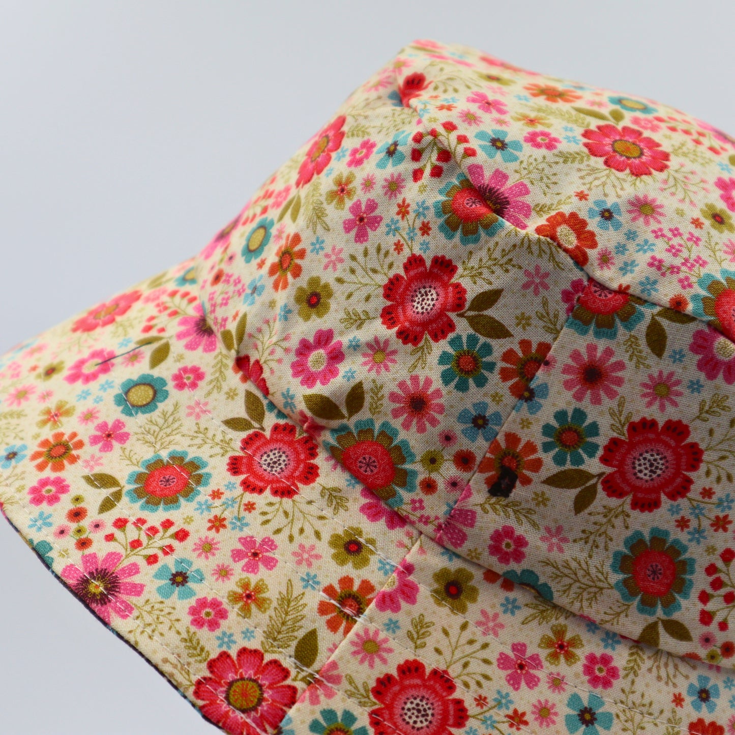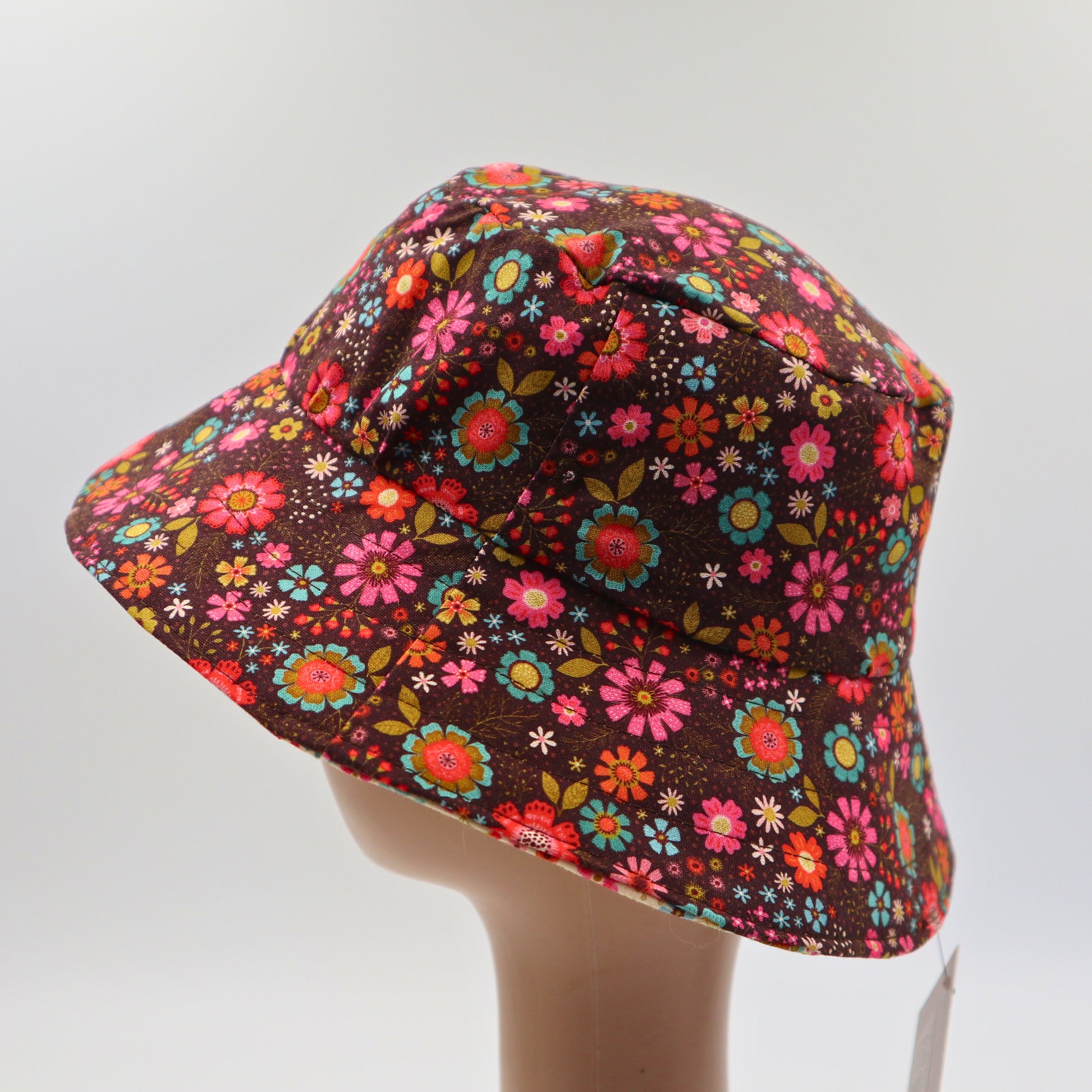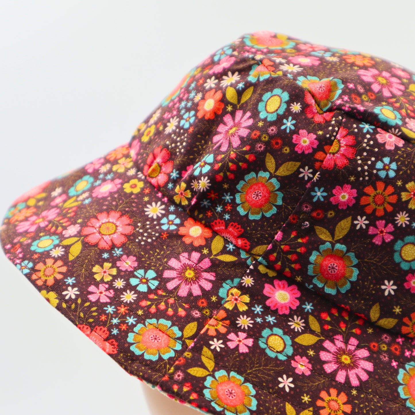 This reversible sun hat is handmade (by me) using high quality 100% cotton fabric. One side is brown with a retro floral print and the other side matching in cream.