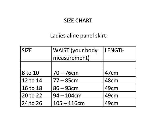 The style of an A-line is very flattering to any woman's figure. I have made it from 6 panels of fabric that taper out to give the shape. There is a flat waistband on the front (which has a slimming effect) and elastic on the back for flexibility and comfort.